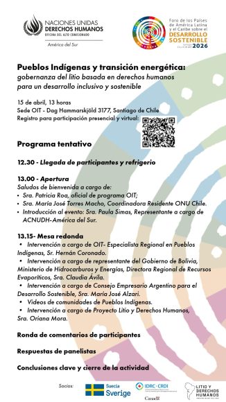 Esta actividad se enmarca en el trabajo que ONU Derechos Humanos en América del Sur viene desarrollando en materia de litio, particularmente en relación con la observación de procesos de consulta a Pueblos Indígenas, la construcción de capacidades, la asistencia técnica a distintos actores y la documentación de casos de interés vinculados con empresas, derechos humanos y transición energética.